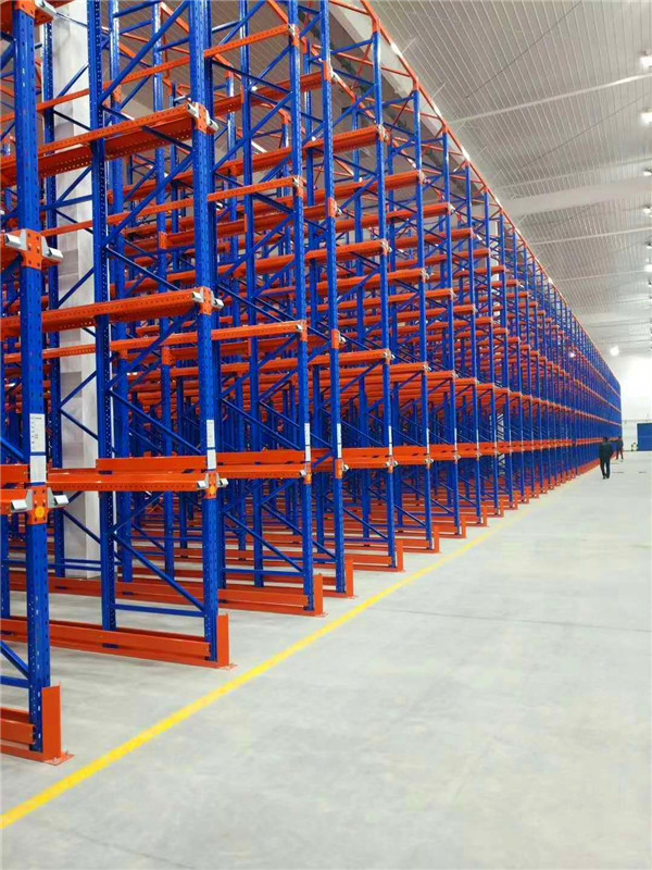 贯通式货架又称通廊式货架或驶入式货架。贯通式货架可供叉车(或带货叉的无人搬运车)驶入通道存取货物,适用于品种少,批量大类型的货物储存。贯通式货架除了靠近通道的货位,由于叉车需要进入货架内部存取货物,通常单面取货建议不超过7个货位深度。为提高叉车运行速度,可根据实际需要选择配置导向轨道,与货位式货架相比,贯通式货架(驶入式货架)的库空间利用率可提高30%以上,贯通式货架(驶入式货架)广泛应用于批发、冷库及食品、烟草行业。
